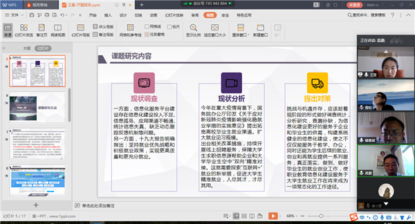 课题主持人王星老师代表课题团队作开题汇报,她的课题题目是《重大疫情背景下职业教育信息化建设服务于大学生就业工作常态化研究》。她从课题的内容、研究思路和方法、预期成果、成员分工等多个方面对课题的进展以及后续计划作了详细的阐述。