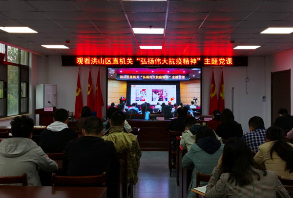 活动第三项,全体与会党员在线观看、学习洪山区直机关主题党课“弘扬伟大抗疫精神”。党课中,来自洪山区建设局、洪山区民政局和洪山区城管局的三位抗疫先进代表发言,三位代表的先进事迹感人至深,是我们的榜样,值得我们每一位党员学习。