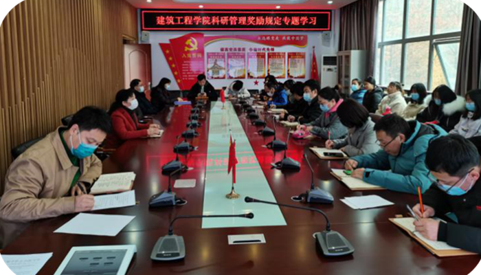 为进一步规范建筑工程学院教职工的科研工作,提升专任教师的科研能力、促进我院发展,2020年12月17日在建筑工程学院在6-1-404会议室,举办了“建筑工程学院科研管理奖励规定专题学习”。
