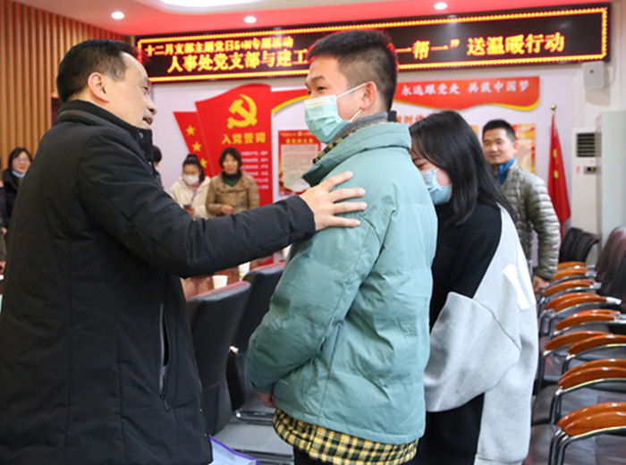 主题活动由人事处党支部书记、处长曾菁同志主持,校长邓院方同志作为人事处党支部的党员代表,为5名同学送上了饱含关爱与深情的慰问物品床上四件套,同学们接过爱心礼物,瞬间感受到了学校领导和老师们暖暖的关爱和情义。