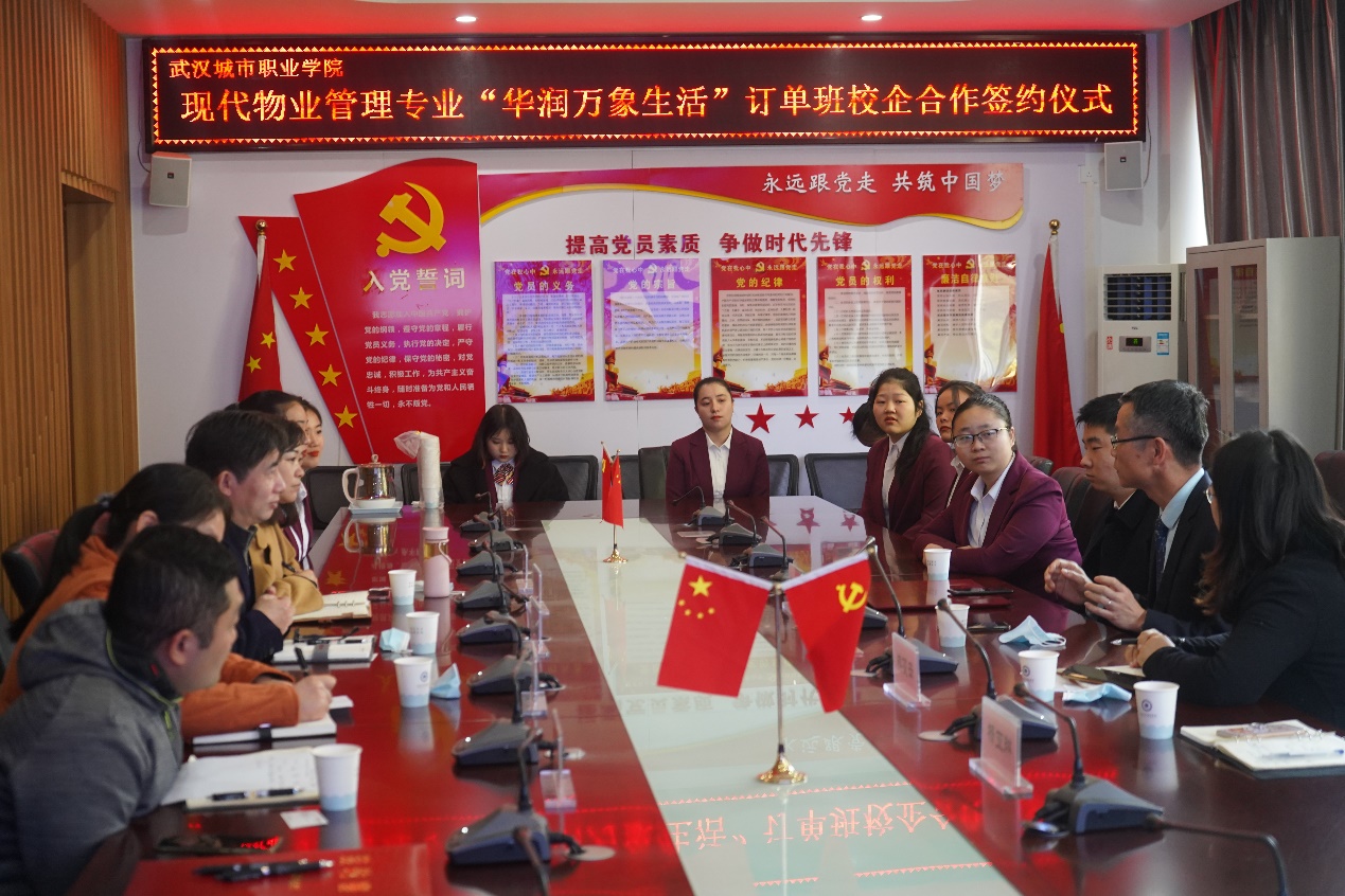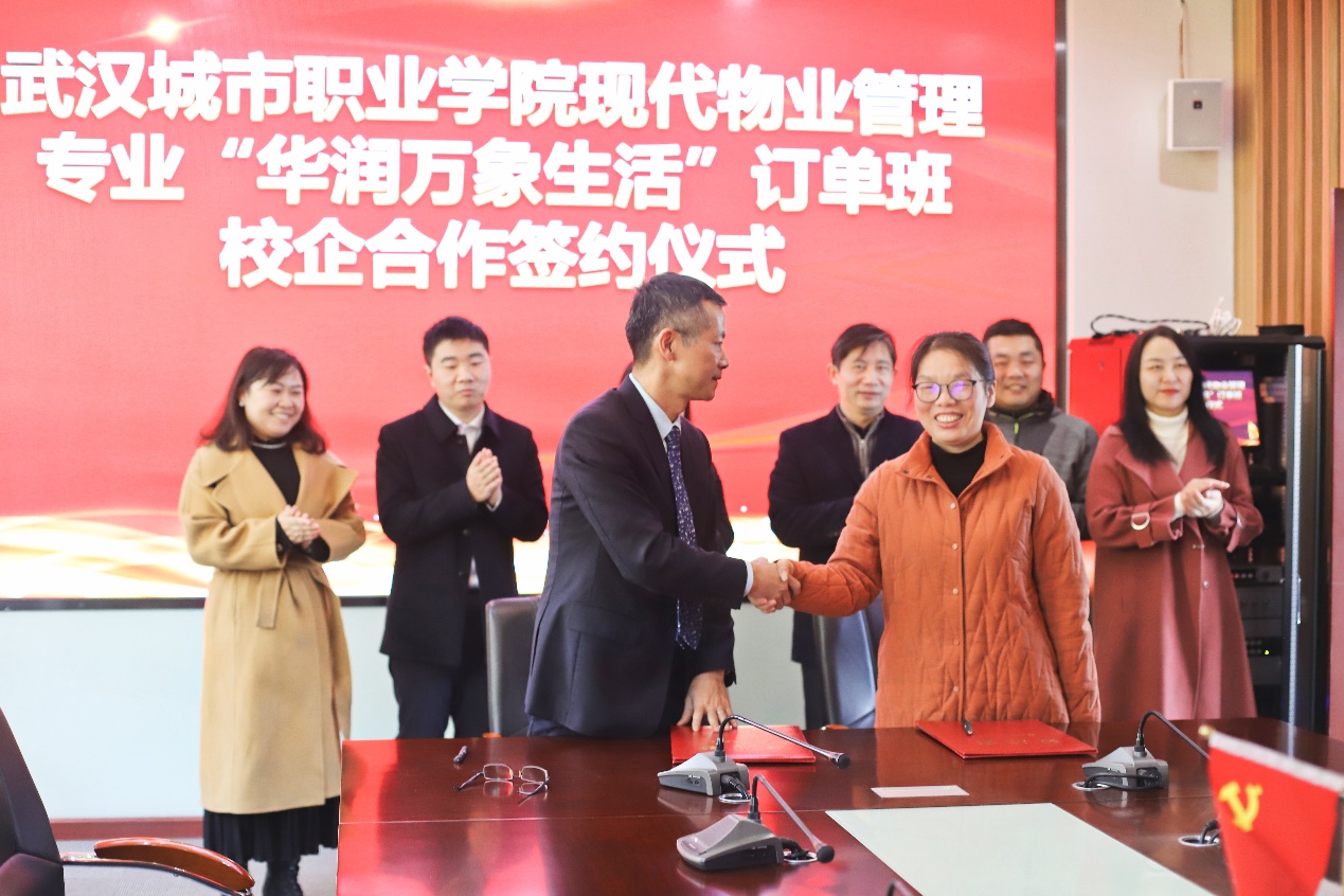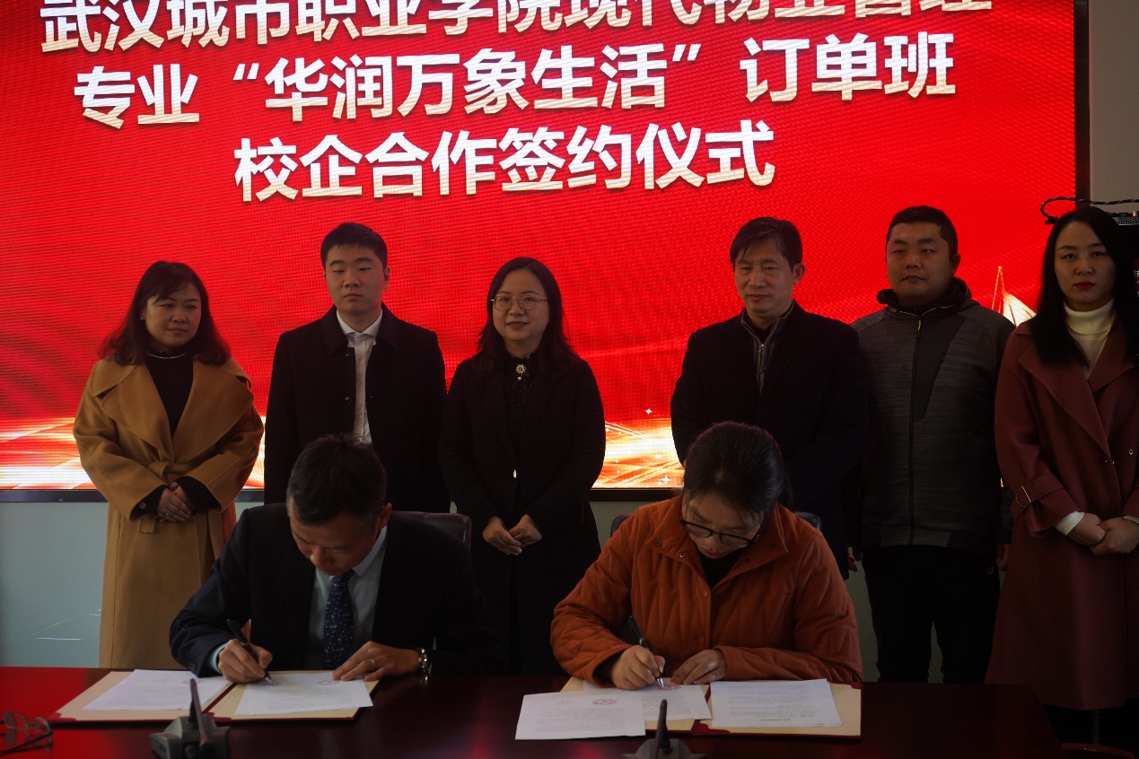 华润万象生活物业武汉中心党总支书记、总经理朱江,物业武汉中心人力行政总监熊凌云,物业武汉中心招聘经理陈恒伟,物业武汉中心品牌主管杨亚琳;武汉城市职业学院建筑工程学院党总支汤国强书记、建筑工程学院苏小梅副院长,教学办主任梅清老师,教学办副主任傅琛老师、现代物业管理专业负责人段红玲老师和现代物业管理专业学生代表出席签约仪式。