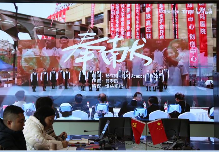 随着歌曲《奉献》优美的伴奏,党员同志们用心去感悟,用歌唱表达心情。“长路奉献给远方,牵挂奉献给月光......”,音乐超越语言,感动着在座的每一位党员。