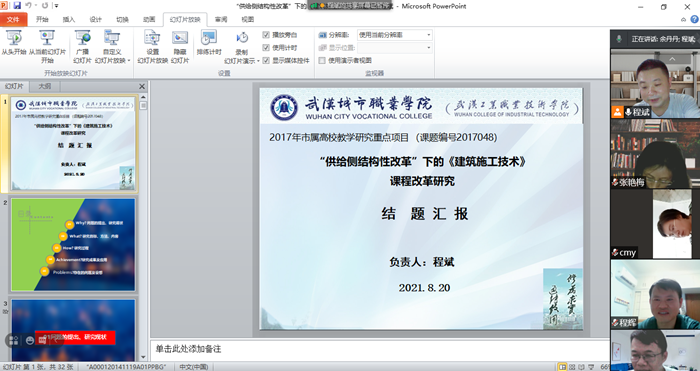 2021年8月20日,由我院程斌老师主持的2017武汉市属高校教学研究重点项目《“供给侧结构性改革”下的《建筑施工技术》课程改革研究》(2017048),在“腾讯会议”线上平台进行了结题评审工作。