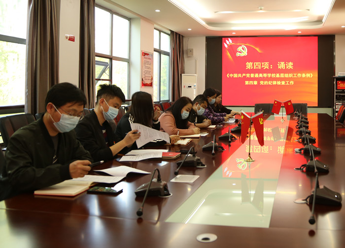 全体与会党员自觉缴纳党费、齐唱国歌、重温入党誓词、集体诵读《中国共产党普通高等学校基层组织工作条例》第四章党的纪律检查工作、为程志超同志过政治生日赠送良言诤语。会上,刘书记围绕4月份支部主题党日重点学习内容提示和习近平近期重要讲话精神向与会党员进行活动部署。