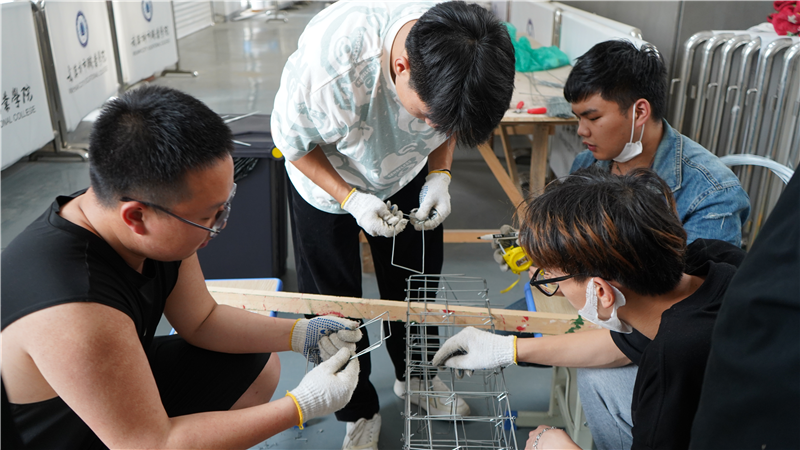 参加本次大赛的选手来自建筑工程技术、工程造价两个专业。大赛以六人一组为参赛单位,一共有十六个组。选手们根据图纸,准确计算钢筋的下料长度,并以准确、规范、快速的方式现场绑扎制作。赛场上,各小组成员齐心协力,分工明确,一丝不苟地绑扎钢筋, 展现了扎实的专业基础。经过三个小时的激烈角逐,经裁判组现场统计评分,最终评选出一等奖2组,二等奖3组,三等奖5组。