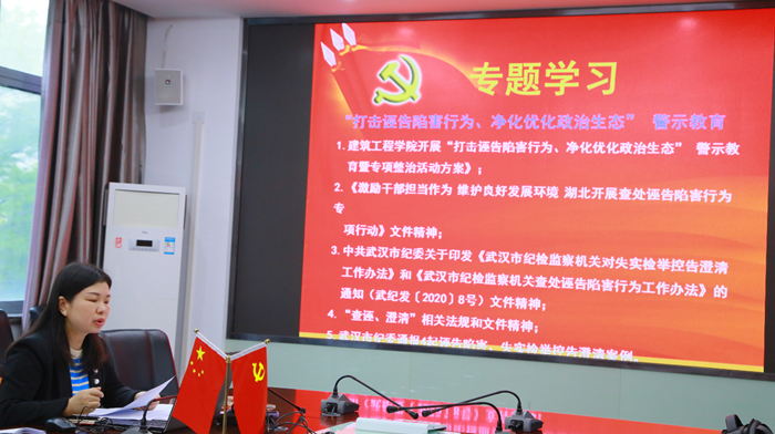 为落实《武汉城市职业学院开展“打击诬告陷害行为、净化优化政治生态”警示教育暨专项整治活动方案》精神,根据学院活动方案要求,学院综合党支部于5月19日上午,在6-1-404开展了“打击诬告陷害行为、净化优化政治生态” 主题警示教育活动,支部书记刘敏同志主持。