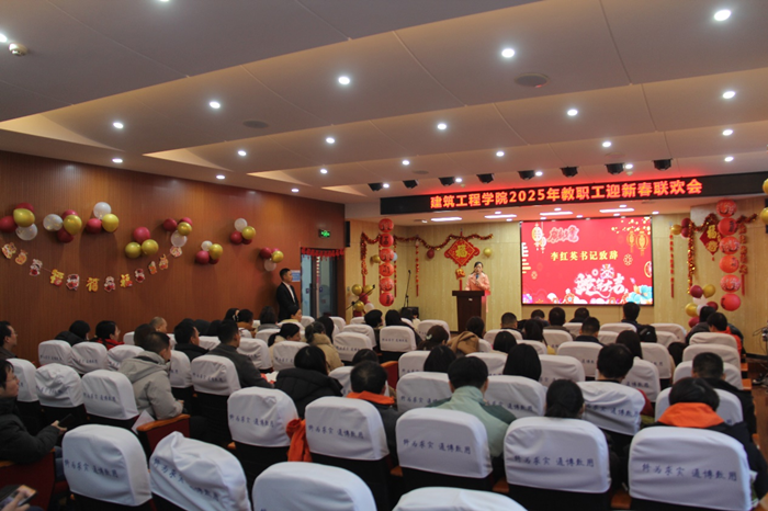 活动伊始,主持人孙静、李庆轩老师盛装登场,以饱满的热情逐一介绍了莅临现场的各位领导与老师,现场气氛庄重且温馨。紧接着,建筑工程学院党总支书记李红英发表了致辞,她饱含深情地回顾了过去一年的点点滴滴,对全体教职工的辛勤付出表示了高度赞扬,并送上了新春的美好祝福与殷切期望。李书记的致辞让在场的每一位教职工都倍感温暖与鼓舞。