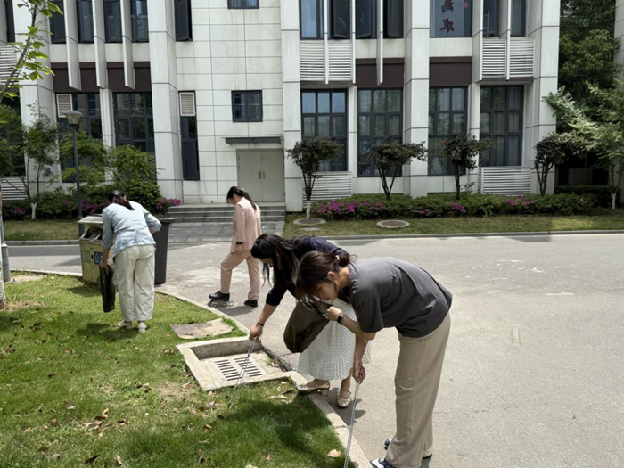 活动现场,老师们干劲十足。大家秉持着“室外环境清扫干净,无白色垃圾、杂物,地面无积水,无蚊蝇孳生地”的标准,分工协作。有的手持扫帚清扫落叶与垃圾,有的专注清理积水,不放过任何卫生死角。