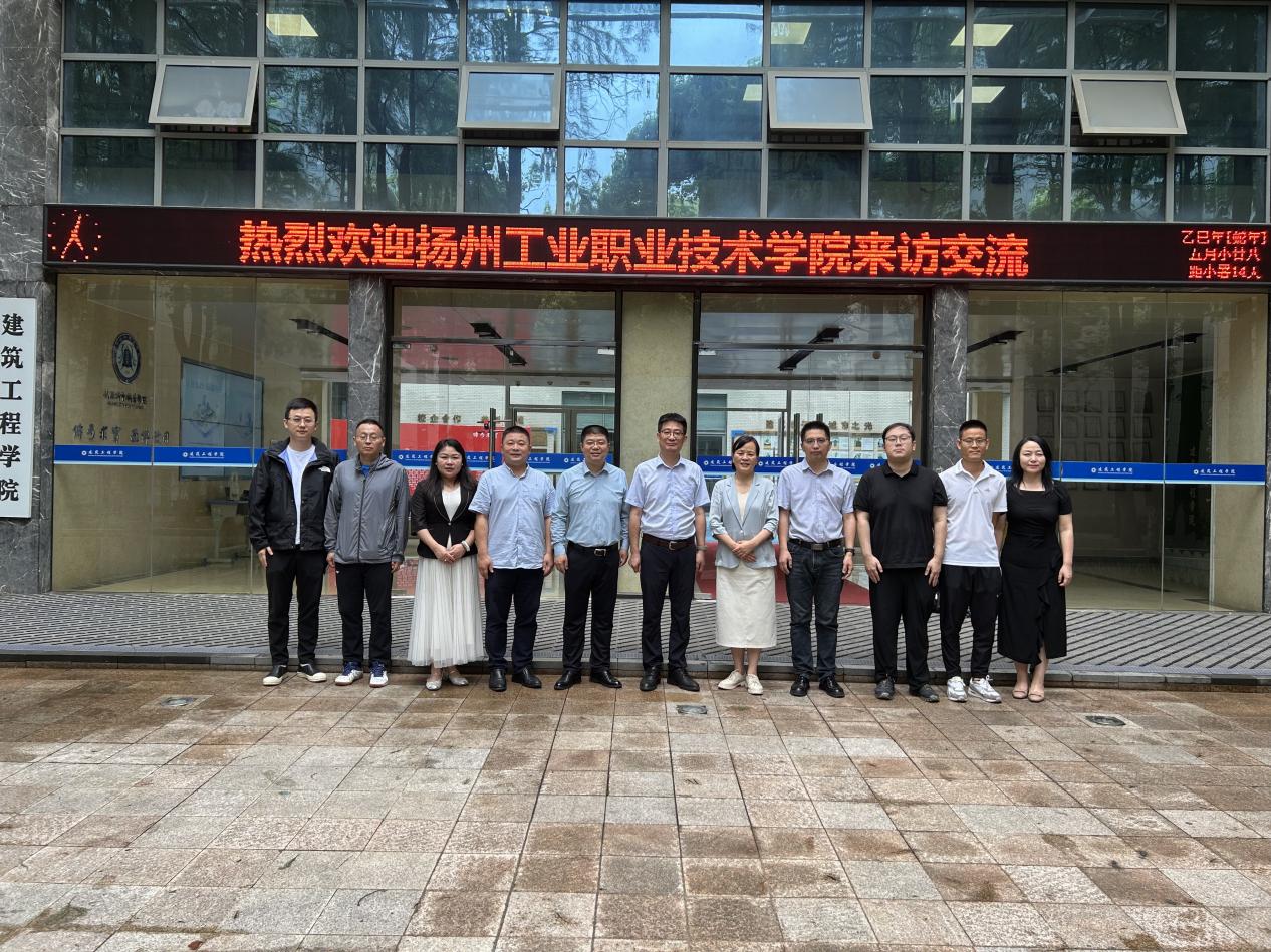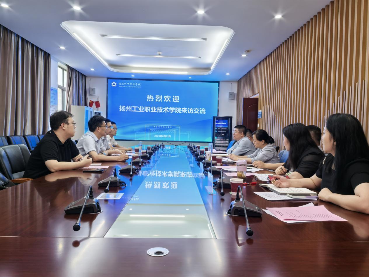 2025 年 6 月 23 日下午,扬州工业职业技术学院建筑工程学院院长张军一行 4 人赴武汉城市职业学院建筑工程学院开展专业建设调研交流,座谈会在 404 会议室召开,由武汉城市职业学院建筑工程学院副院长张善军主持,学院党总支书记李红英、副院长程斌、教学办主任傅琛、建筑工程技术专业负责人彭忠、现代物业管理专业负责人段红玲、工程测量技术专业负责人黄晓翔参加了交流会。